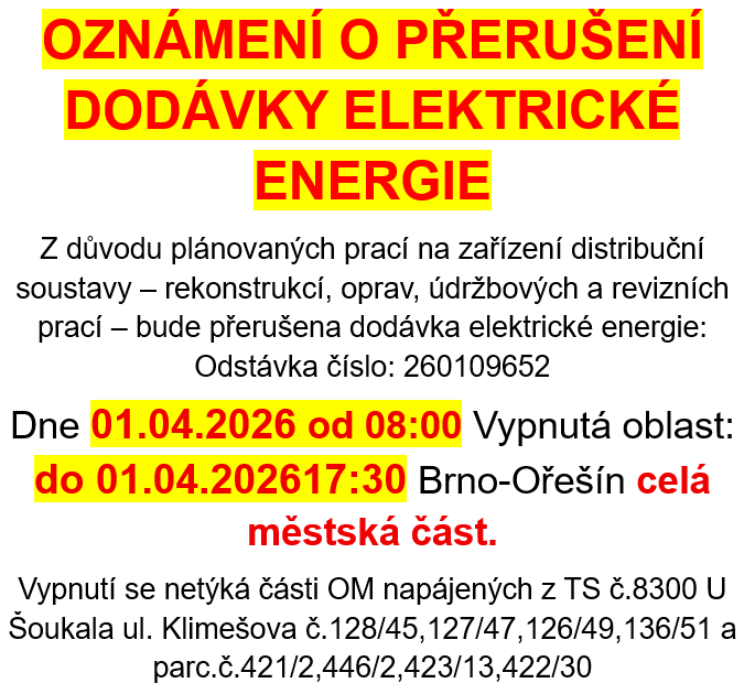 Upozornění: V době přerušení dodávky elektřiny je nutné z důvodu bezpečnosti považovat energetické zařízení za zařízení pod napětím. Případné použití vlastního náhradního zdroje v době přerušení dodávky elektřiny je nutné předem vždy projednat se společností EG.D, s.r.o. Pro případné další informace volejte Nonstop linku EG.D 800 22 55 77 nebo navštivte www.egd.cz, kde najdete další informace o přerušení dodávek elektřiny. Děkujeme Vám za pochopení. EG.D, s.r.o