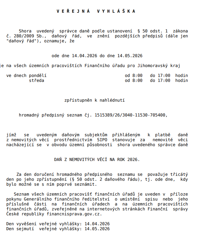 na všech územních pracovištích Finančního úřadu pro Jihomoravský kraj budou zpřístupněny k nahlédnutí hromadné předpisné seznamy (dále jen „HPS“):